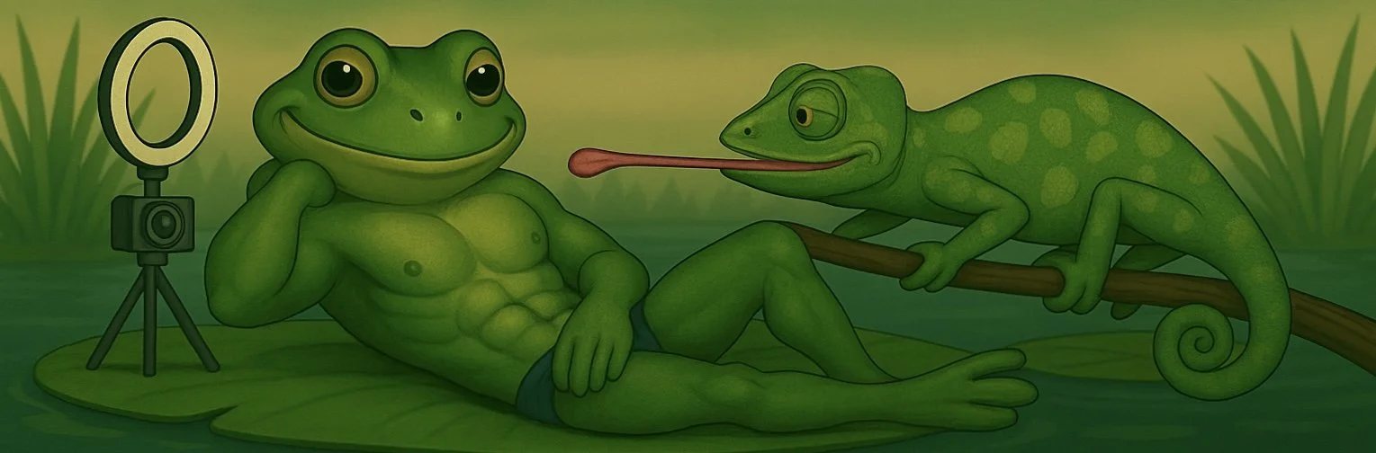 Our mascot is a ripped anthropomorphic frog who can’t seem to finish a flex without having his waistband yanked by a mischievous chameleon. He's the gym twunk of the lily pad, and the OnlyFans frog you didn’t know you needed.